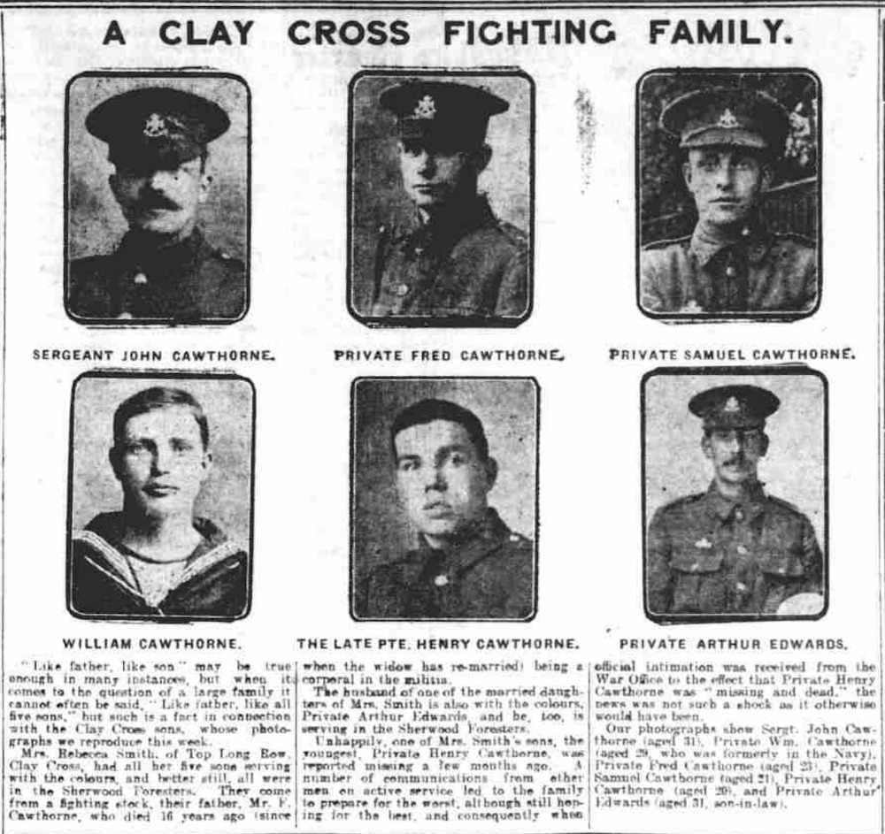 Born at Whittington, Derbyshire. Son of Frederick and Rebecca Cawthorne, of Long Row, Clay Cross, Derbyshire. He was a coal miner prior to enlisting on 23rd August 1914 at Clay Cross. He went to France on 26th January 1915 and was killed in action, 9th August 1915, age 21, in the attack on the German positions at Sanctuary Wood, Belgium.