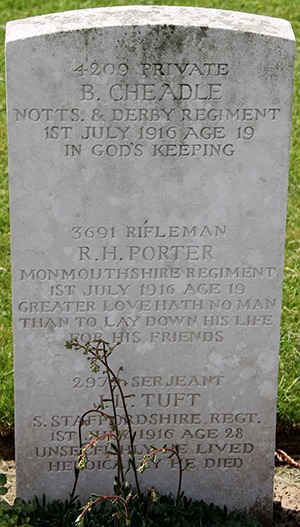 Born in Birmingham and lived at 196 Montague Road, Smethwick, Staffordshire. Son of Griffen Gibson Cheadle and Charlotte Cheadle, of 21, Full Street, Derby. He was a Silversmith prior to enlisting on 26th March 1915 at Derby. He went to France on 10th November 1915 and was killed in action, on 1st July 1916, aged 19, in the attack on the German positions at Gommecourt, France, on the first day of the Battle of the Somme.