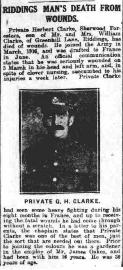 He was born at Clophill, Bedfordshire and lived at 1 Lea Brooks, Riddings, Derbyshire. Son of William and Mary Clark, of 5, Riddings, Alfreton, Derbyshire. He was a gardener prior to enlisting at Derby He died of wounds on 12th March 1917, aged 30.