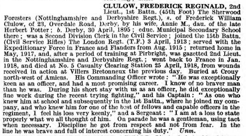 Born 30th April 1895 at Derby. Son of Frederick William and Annie Maria Clulow, of 23, Overdale Road, Derby. He was a civil service clerk prior to enlisting in London. He gained a commission into the 3rd Battalion Sherwood Foresters (Notts & Derbys) Regiment and went to France January 1918 joining the 1st Battalion Sherwood Foresters (Notts & Derbys) Regiment. He died of wounds, 25th April 1918, aged 23, at 5 Casualty Clearing Station, of wounds, received in action at Villers Bretonneaux, France.