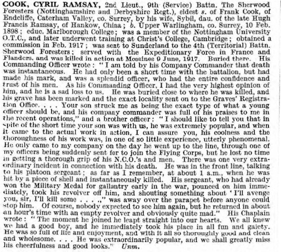 Born 10th February 1898 at Upper Warlingham, Surrey. Son of Frank and Sybil Cook, of Endcliffe, Caterham Valley, Surrey. He was educated at Marlborough College and was a member of the Nottingham University Training Corps. He was commissioned Second Lieutenant Sherwood Foresters (Notts & Derbys) Regiment, 1st March 1917 and joined the 9th Battalion Sherwood Foresters (Notts & Derbys) Regiment at Bapaume, France 25th April 1917. He was killed in action, 9th June 1917, aged 19, in the attack at Wytschaete, near Ypres, Belgium.