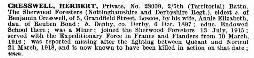 Born at Denby, Derbyshire, 6th December 1897. Son of Benjamin and Annie Elizabeth Cresswell, of 5, Grandfield Street, Loscoe, Codnor, Derbyshire. He was a coal miner prior to enlisting on 13th July 1915 at Ilkeston, Derbyshire. He went to France 10th March 1916 and was killed in action, 21st March 1918, aged 20, whilst holding the line near Noreuil, France on the opening day of the German Spring Offensive or (Kaiserschlact)