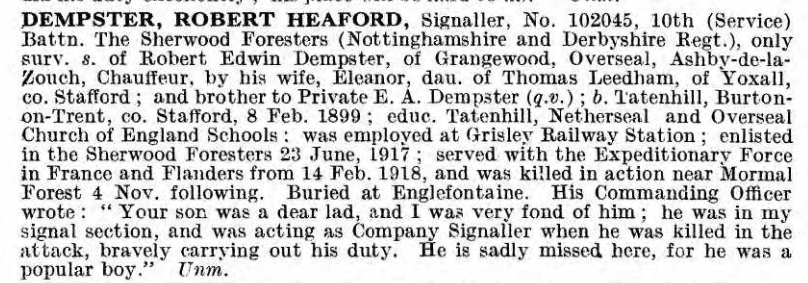 Son of Robert Edwin and Eleanor Dempster, of The Well House Cottage, Banstead, Surrey. A native of Collingwood, Tatenhill, Burton-On-Trent, Staffordshire.