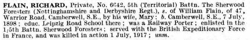 Son of William and Mary Flain, of 47, Warrior Road, Camberwell, London.