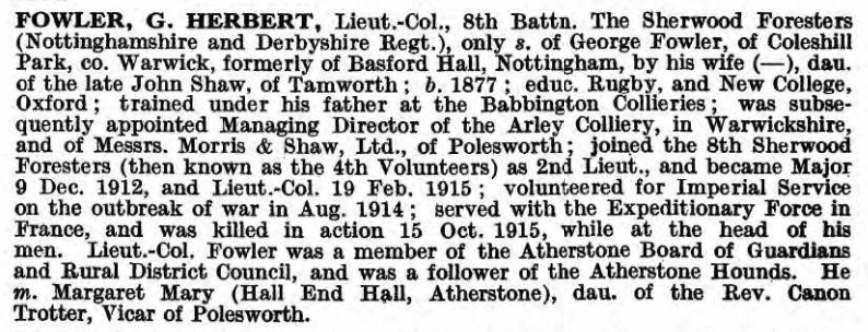 Son of George Fowler, of Basford Hall, Basford, Nottingham. Husband of Mrs Fowler, of 24, Low Pavement, Nottingham. Commissioned 4th Volunteer Battalion Sherwood Foresters (Notts & Derbys) Regiment as Lieutenant 26th June 1901. He was promoted Captain 24th January 1903 and posted to the 8th Battalion Sherwood Foresters (Notts & Derbys) Regiment 1908. He was promoted to Major 9th December 1912 and Lieutenant Colonel 19th February 1915. He went to France on 1st March 1915 and was killed in action by a sniper, 15th October 1915, at the Hohenzollern Redoubt, at Auchy-les-Mines, near Loos, France whilst attempting to rescue Major Becher, who was severely wounded 30 yards away from the German lines.