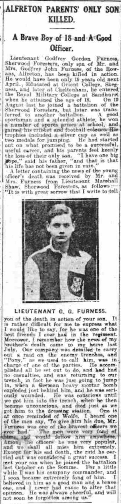 Son of Godfrey John and Isabell Furness, of The Rowans, Alfreton, Derbyshire. He was educated at Dean Close Memorial School, Shelbourne Road, Cheltenham, Gloucestershire. Was commissioned in the Sherwood Foresters (Notts & Derbys) Regiment on 19th July 1916 and joined the 2nd Battalion Sherwood Foresters (Notts & Derbys) Regiment at Montauban, France 13th October 1916. He was killed in action, on 9th February 1917, aged 18, during a raid on the German trenches near Mazingarbe, France.