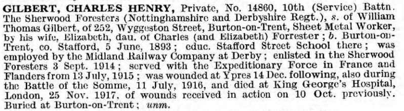 Son of Mr. W. T. and Mrs. E. Gilbert, of 252, Wyggeston Street, Burton-On-Trent.