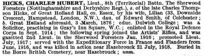 Son of Charles Thompson Hicks and Lilian Martha Hicks, of Great Holland Hall; Born At Gt. Holland, Essex.
