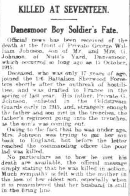 Son of Mrs Annie Johnson, of Nutts Yard, Danesmoor, Clay Cross, Ashbourne, Derbyshire.