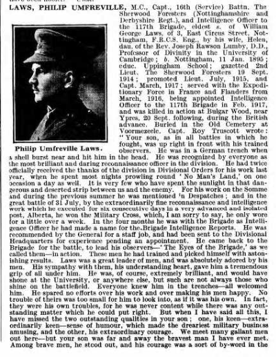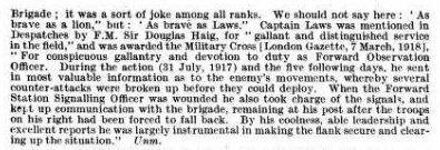 London Gazette 18th October 1917, When in the St Julien Sector between 1st and 5th August 1917, As forward observation officer during the action and the five following days he sent in most valuable information as to the enemy’s movements, whereby several counter-attacks were broken up before they could deploy. When the forward station signalling officer was wounded he also took charge of the signals, and kept up communication with the Brigade, remaining at his post after the troops on his right had been forced to fall back. By his coolness, able leadership and excellent reports he was largely instrumental in making the flank secure and clearing up the situation:
