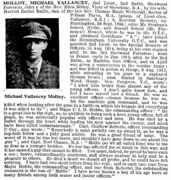 Son of The Revd. Eben and Mrs. Molloy, of Shenstone Vicarage, Lichfield, Staffordshire.