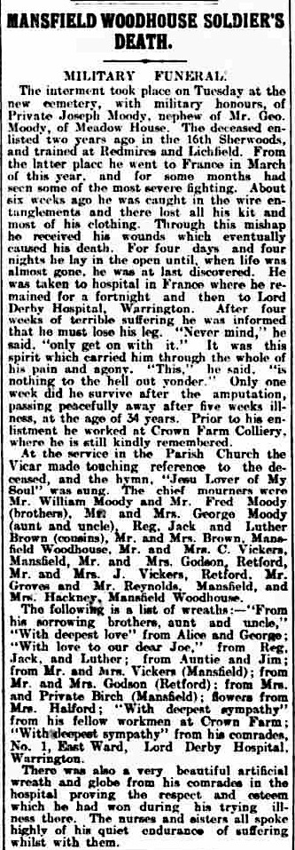 Born at North Thorsby, Lincolnshire and lived at 51, High Street, Mansfield Woodhouse, Nottinghamshire. Son of Joseph and Phoebe Moody. He was shunter at Crown Farm Colliery, Mansfield, prior to enlisting at Mansfield 27th May 1915. He went to France 6th March 1916 and suffered gunshot wounds to his right thigh, 10th October 1916. He was treated at 49 Casualty Clearing Station Grove Town , Meaulte, France. He was transferred to No. 3 Stationary Hospital Rouen, France, 14th October 1916 and to England on Hospital Ship Western Australia, 23rd October 1916. He died, 8th November 1916, aged 34, at the Lord Derby War Hospital, Warrington, Cheshire, from secondary haemorrhage after amputation.