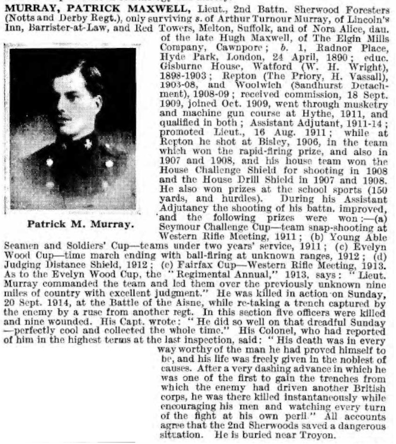 Born in London, on 24th April 1890. Son of Arthur Turnour Murray and Nora Alice Murray, of Red Towers, Melton, Suffolk. He was educated at the Reverend W. H. Wright’s Preparatory School, Gisburne House, Watford, and at Repton School, Derbyshire, from which he went to the Royal Military Academy, Woolwich. He joined the Sherwood Foresters (Notts & Derbys) Regiment, as Second Lieutenant, on 18th September 1909, when he was posted to the 2nd Battalion and was appointed Assistant Adjutant, in April 1911, and promoted Lieutenant, on 18th August 1911. He went to France on 11th September 1914 and was killed in action, on 20th September 1914, aged 24, near Soissons during the First Battle of the Aisne, when directing the fire of his men after they had recaptured a trench lost to the Germans