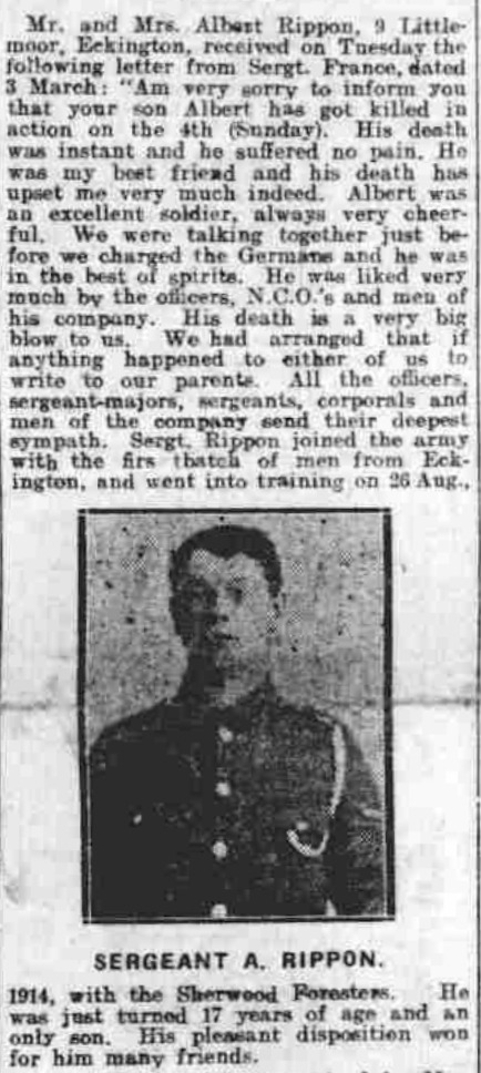 Son of Albert and Annie Rippon, of 9, Littlemoor, Eckington, Derbyshire.