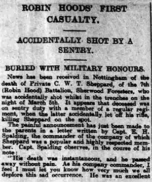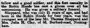 Born at Basford, Nottingham. Son of Thomas and Julia Holmes Sheppard of 124, Hucknall Road, Carrington, Nottingham. He was a mechanic at Handley’s Clumber Street, Nottingham. He enlisted at Nottingham 4th May 1911, went to France 28th February 1915 and was killed in a trench when a Lance Corporal of the 1st Battalion Hampshire Regiment was cleaning his rifle and accidentally discharged a bullet, which hit Private Sheppard. He died 6th March 1915, age 21.