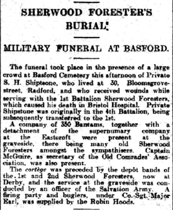 Lived at 30 Bloomsgrove Street, Radford, Nottingham. He went to France 4th January 1915 and died 17th May 1915.