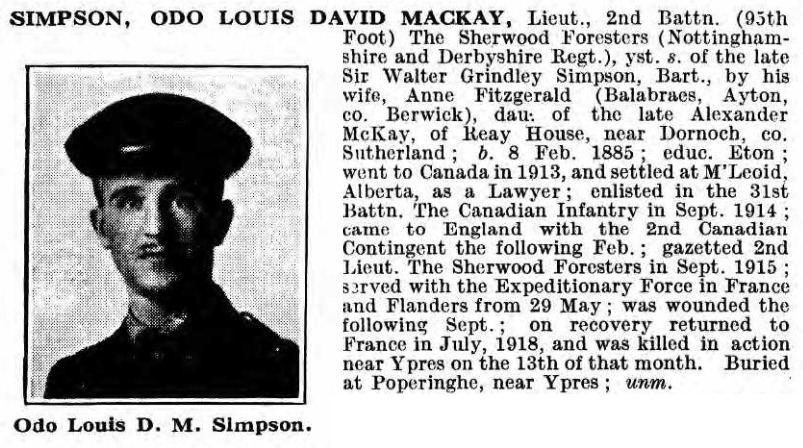 Born 8th February 1885. Son of Sir Walter Grindley Simpson, Bart and Lady Simpson, of Balabraes, Ayton, Berwickshire. Educated at Eton College. He went to Canada in 1913 and worked as a lawyer in Alberta. He enlisted in the 32nd Battalion Canadian Infantry in September 1914 and sailed to England in February 1915. He transferred to the 2nd Battalion Sherwood Foresters on 1st September 1915 and went to France on 29th May 1916. He joined the 16th Battalion Sherwood Foresters on 5th June 1916 and was wounded at Beaumonth Hamel, Somme and evacuated to England. On recovery, he rejoined the 2nd Battalion and was killed in action on 13th July 1918 at Ridge Wood near Ypres, Belgium age 34.
