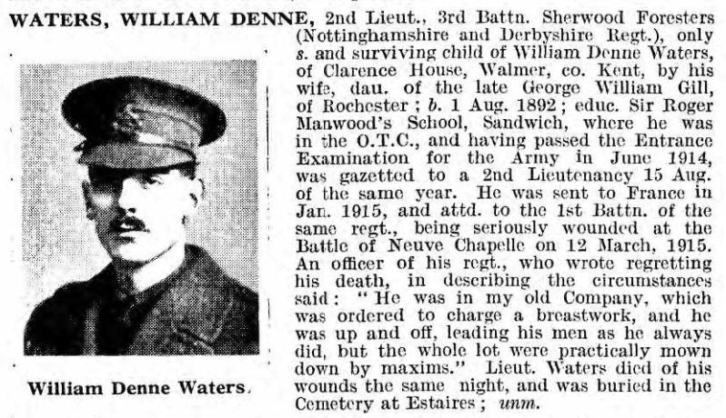 Son of William Denne Waters and Ellen Eugenie Waters, of Clarence House, Walmer, Kent. He went to France on 7th January 1914 and was killed in action, on 12th March 1915, aged 22, in the German counter-attack and then the British counter-attack during the Battle of Neuve Chapelle, France.